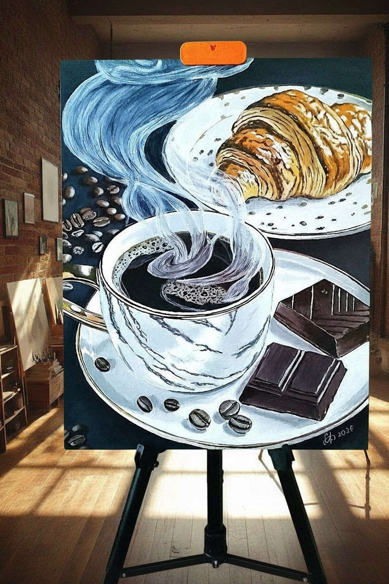 В центре композиции — чашка горячего черного кофе, над которой поднимается густой, почти осязаемый пар. Художник изобразил его такими красивыми завитками, что кажется, будто в комнате сразу запахло свежеобжаренными зернами. Рядом на тарелках лежит идеальный завтрак: пышный золотистый круассан и пара долек темного шоколада. Рассыпанные повсюду кофейные зерна добавляют картинке завершенности. Сама работа выполнена в контрастных тонах: светлая посуда и яркая выпечка очень эффектно смотрятся на темном фоне. Картина стоит на мольберте в солнечной мастерской, и этот теплый свет из окна делает изображение еще более «живым» и аппетитным. От нее так и веет спокойствием и удовольствием от момента.
