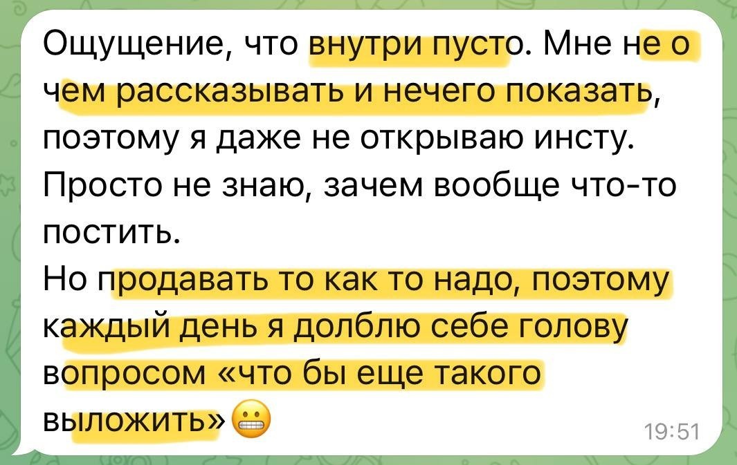 Не мудрено в один прекрасный день проснуться и почувствовать себя опустошенным, когда ты просто не понимаешь, о чем еще сказать и что выложить в рилс такого, чтобы пробить свой потолок просмотров?