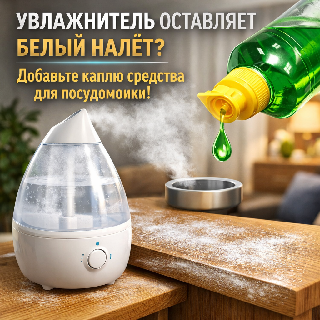 💧 Увлажнитель воздуха оставляет белый налёт на мебели? Фильтры не спасут. Добавьте в воду каплю средства для посудомойки.