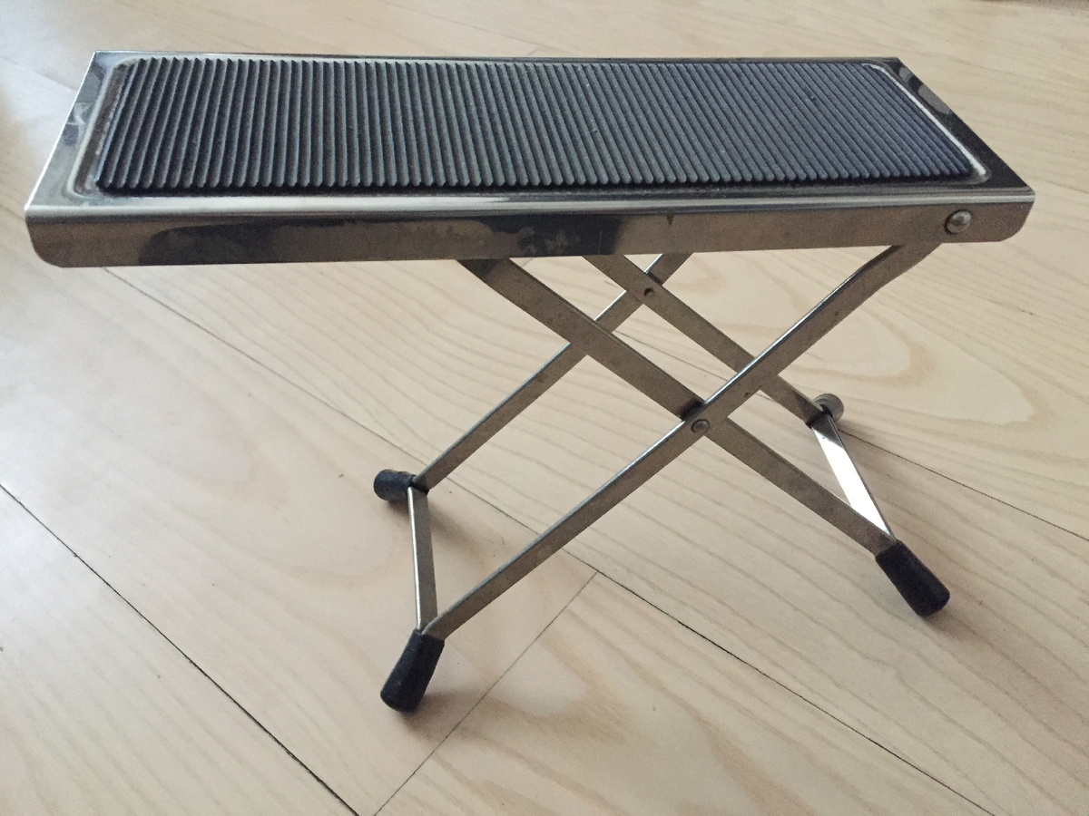 Для правильной посадки необходима специальная подставка под левую ногу: Подставка под левую ногу настраивается в зависимости от роста гитариста. Настройка высоты подставки зависит от высоты головки грифа и угла 45 градусов (об этом скажем ниже). Сядьте на стул ровно, ближе к краю, не облокачивайтесь на спинку стула. Стул должен быть без подлокотников и колёс. Спина ровная, слегка наклонена вперёд. Плечи расслаблены. Ноги расставлены достаточно широко, чтобы нижняя часть корпуса гитары находилась между ног. Левая нога на подставке, правая на полу касается поверхности пола всей ступнёй. Первая точка опоры - это бедро левой ноги. Выемка нижней обечайки гитары опирается на бедро левой ноги. Широкая часть деки гитары находится между ног. Внутренней частью бедра правой ноги мы касаемся нижнего заднего ребра корпуса гитары, слегка его придавливая. Гитара должна находиться примерно под углом 45 градусов относительно вертикали вашего тела. Вторая точка опоры - грудь. Мы касаемся груди верх