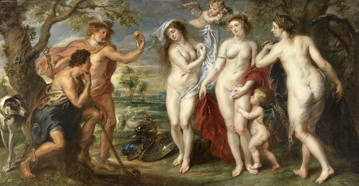 Перед нами картина великого фламандского живописца Питера Пауля Рубенса (1577–1640). Она изображает одну из любимейших тем художников — Суда Париса, который состоялся на свадьбе царя Пелея и нимфы Фетиды. Богиня разора Эрида решила позабавиться и создала золотое яблоко, достойное лишь самой прекраснейшей из богинь. Решать кто ею будет, было поручено Парису. И тот, после долгих размышлений отдал яблоко Афродите (Венере), получив взамен любовь Елены Прекрасной. Рубенс, как и другие художники, любил эту легенду и неоднократно иллюстрировал её. Поскольку она позволяла ему продемонстрировать свой талант в изображении женского тела, а также показать нравоучительность истории, показав последствия необдуманной страсти — из-за выбора Париса началась Троянская война. Эта картина была заказана братом короля Испании Филиппа IV, кардиналом Фердинандом Австрийским, который был губернатором Южных Нидерландов. Он хотел подарить её брату королю, и картина Фердинанду очень понравилась, о чём он писал