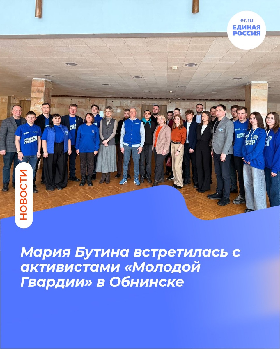 Депутат Госдумы от «Единой России» Мария Бутина в рамках рабочей поездки в Обнинск провела встречу с активистами местного и регионального отделений «Молодой Гвардии Единой России». Руководители отделений МГЕР Валентин Чайников и Алексей Орев представили проекты и основные направления работы, включая перезапуск деятельности в регионе. Обсуждались планы совместных мероприятий, в том числе на площадке Технической академии Росатома. Встреча, прошедшая при участии представителей науки, образования и депутата Заксобрания области Евгений Чуркина, была продуктивной: по её итогам уже разработан план дальнейшего взаимодействия. Мария Владимировна выразила благодарность местному отделению партии «Единая Россия», исполнительному секретарю Любови Постниковой и руководителю регионального исполкома Партии Алексею Максименко. 💙ВК|📝ДЗЕН