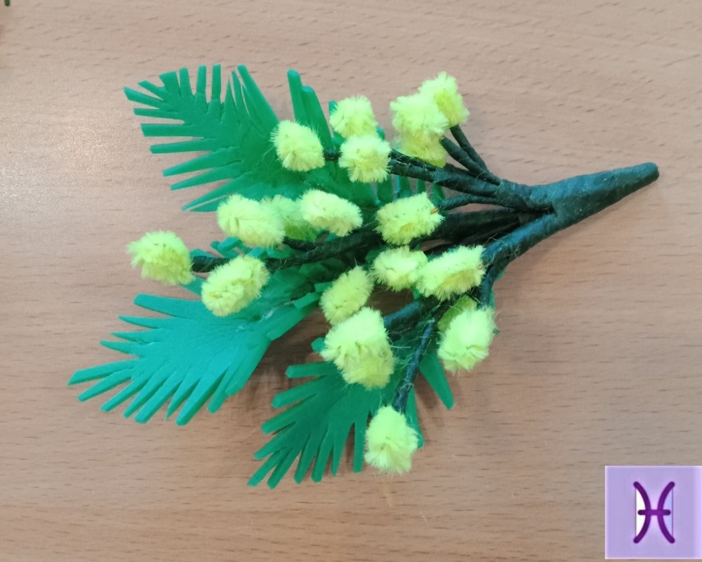 Скоро, скоро весна. У нас в клубе выходного дня состоялись очередные посиделки. Ну, не просто посиделки, а с пользой. Мы своими ручками делали мимозу. А основными материалами послужили синельная проволока и фоамиран. Вот такую брошь мастерица Александра предложила нам сделать. Но, в результате кто-то делал брошь, а кто-то просто веточку мимозы. Я решила делать брошь. Для изготовления мимозы необходимы: - синельная проволока желтого цвета - фоамиран зеленого цвета толщиной 1 мм - проволока тонкая мягкая 0,3 мм - 0,4 мм - тейп лента - клей ( можно любой - Момент, термо) - брошечная булавка Итак, из фоамирана вырезаем листочки для мимозы. Для броши достаточно 3 штук. Размер кусочка фоамирана для листка примерно 10 см х 4 см. Синельную проволоку режем на кусочки. Из одной штуки получается 6 - 7 отрезков, в зависимости от того, какой длины отрезать кусочки, чуть длиннее или чуть короче. Для броши необходимо нарезать 30 - 35 шт. Далее, режем рукодельную медную проволоку на отрезки размером