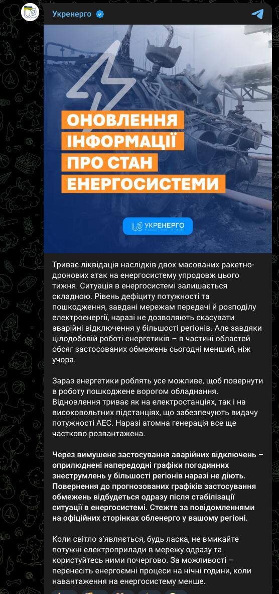 В «Укрэнерго» сообщили о критической ситуации в энергосистеме страны после недавних ударов по инфраструктуре. В большинстве регионов введены аварийные отключения, которые невозможно спрогнозировать заранее. Ранее опубликованные графики почасовых отключений (ГПО) в данный момент неактуальны. Причиной стали высокий уровень дефицита мощности и серьезные повреждения сетей передачи и распределения электроэнергии. Энергетики подчеркивают, что текущее состояние системы пока не позволяет вернуться к плановым ограничениям в большинстве областей. Сайт "Другая Украина" / Telegram / Вконтакте / Центр поддержки Украинцев / Жалоба на ТЦК "Другая Украина" теперь в МАХ