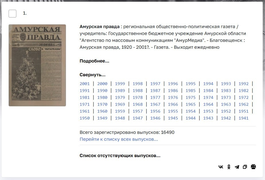 Встречайте "Амурскую правду": областную газету Амурской области, отсканированную и опубликованную на сайте Амурской областной научной библиотеки им. Н. Н. Муравьева-Амурского (г. Благовещенск). Доступно 16,5 тыс. выпусков за 1941-2001 годы. Поиск по текстам, дате публикации, переход непосредственно к описанию выпуска на "сайте-держателе" ресурса. https://i.irklib.ru/amur