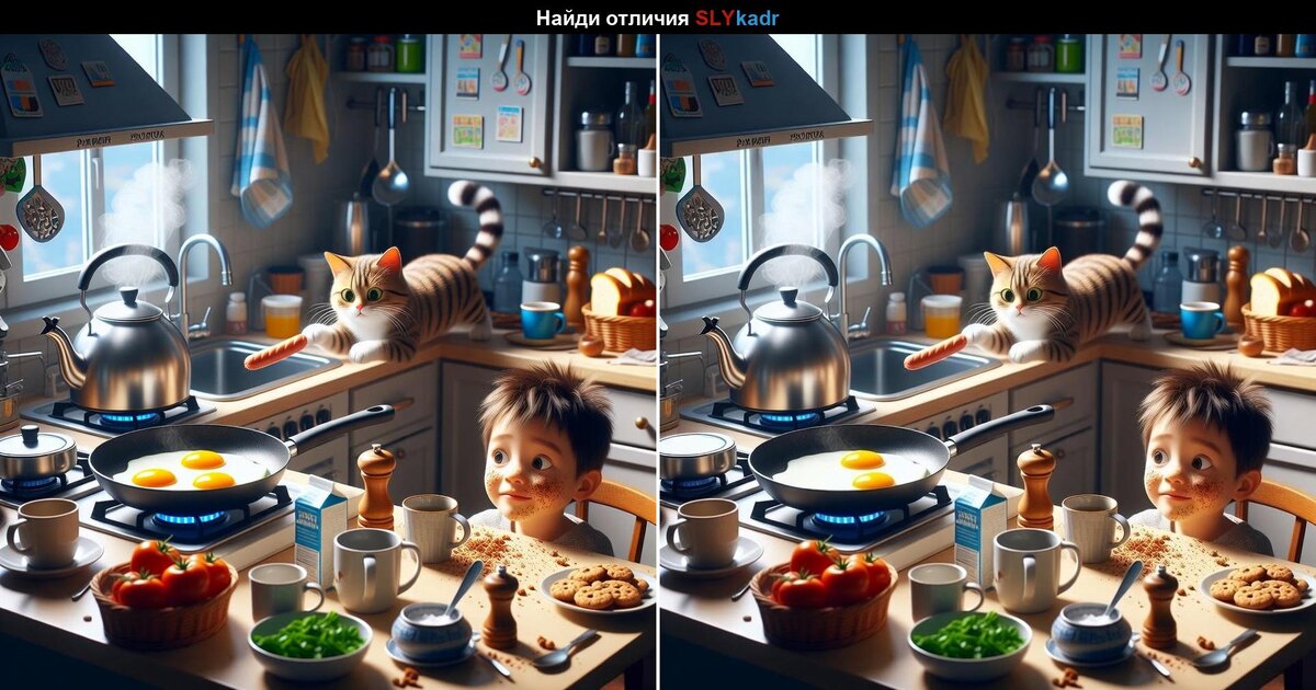 Кот явно решил помочь с завтраком, а мелкие детали так и просятся, чтобы их заметили. Перед вами две почти одинаковые картинки — сможете ли вы найти все отличия?