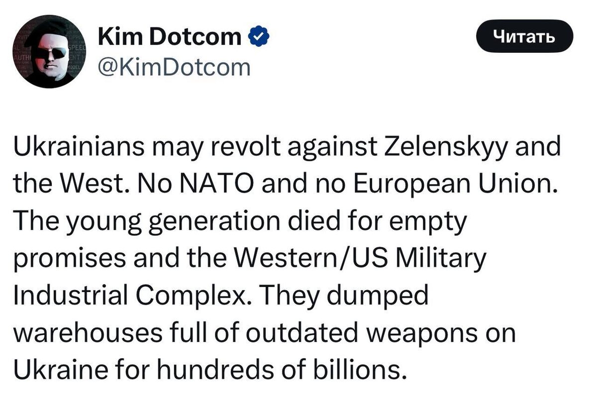 Украинцы могут восстать против Зеленского и Запада. Нет НАТО и нет ЕС. Молодое поколение погибло за пустые обещания и военно-промышленный комплекс Запада/США. Они сбросили Украине целые склады устаревшего оружия за сотни миллиардов.