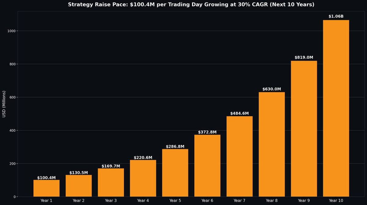 Пока коршуны кружат над Strategy, давайте спокойно, без истерик и лозунгов, разберём цифры. Потому что тут не «хайп», а чистая механика. В 2025 году, который многие называют «плохим годом для биткоина», Strategy привлекла $25.3 млрд. Берём сухую арифметику: 252 торговых дня. $25.3B / 252 ≈ $100.4 млн в день. Не «в среднем за месяц», не «в удачные периоды», а каждый торговый день. И это почти без операционных издержек, без заводов, без логистики. Деньги сразу конвертируются в цифровую редкость. Теперь включаем второй слой — время. Если биткоин действительно растёт в среднем на 30% CAGR в течение следующего десятилетия, то каждые $100 млн, привлечённые в 2025 году, в терминах 2035 года — это уже больше $1 млрд покупательной способности. И вот здесь большинство ломается. Потому что рынок привык думать линейно, а тут работает экспонента. Дальше — ещё интереснее. В 2026 году: $3.827 млрд привлечено за 20 торговых дней. Это примерно $187.6 млн в день. То есть темп не падает. Он уск
