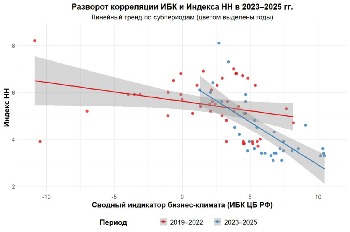 Телеграм канал HR-аналитики HH опубликовал Индекс за январь, с прогнозом я не попал, в моем прогнозе границы были такие 8, 44 – 9, 58 Т.е. Индекс HH пробил верхнюю границу прогноза. О чем это говорит содержательно? Недавно писал пост (диаграмма из него): резюме не равно безработный, новые резюме это еще реакция сотрудников на ситуацию в компании. Это увеличение недовольства зарплатой, условиями работы, менеджментом Обвала нет, но рынок явно становится нервным: сотрудники реагируют на ухудшение ожиданий быстрее и резче, чем раньше, а бизнес — осторожнее с вакансиями. В таких условиях Индекс HH начинает вести себя не как плавный макроиндикатор, а как чувствительный барометр настроений. Это еще не обвал рынка и не паника, но зона повышенной нестабильности. Заодно я посчитал прогноз Индекса HH на февраль при существующем уровне бизнес настроений (а они ведь могут и ухудшиться). Так вот прогноз такой: 9, 5 - 10, 67 Т.е. мы пробьем отметку 10. Хорошая у нас динамика рынка труда? Были еще ша