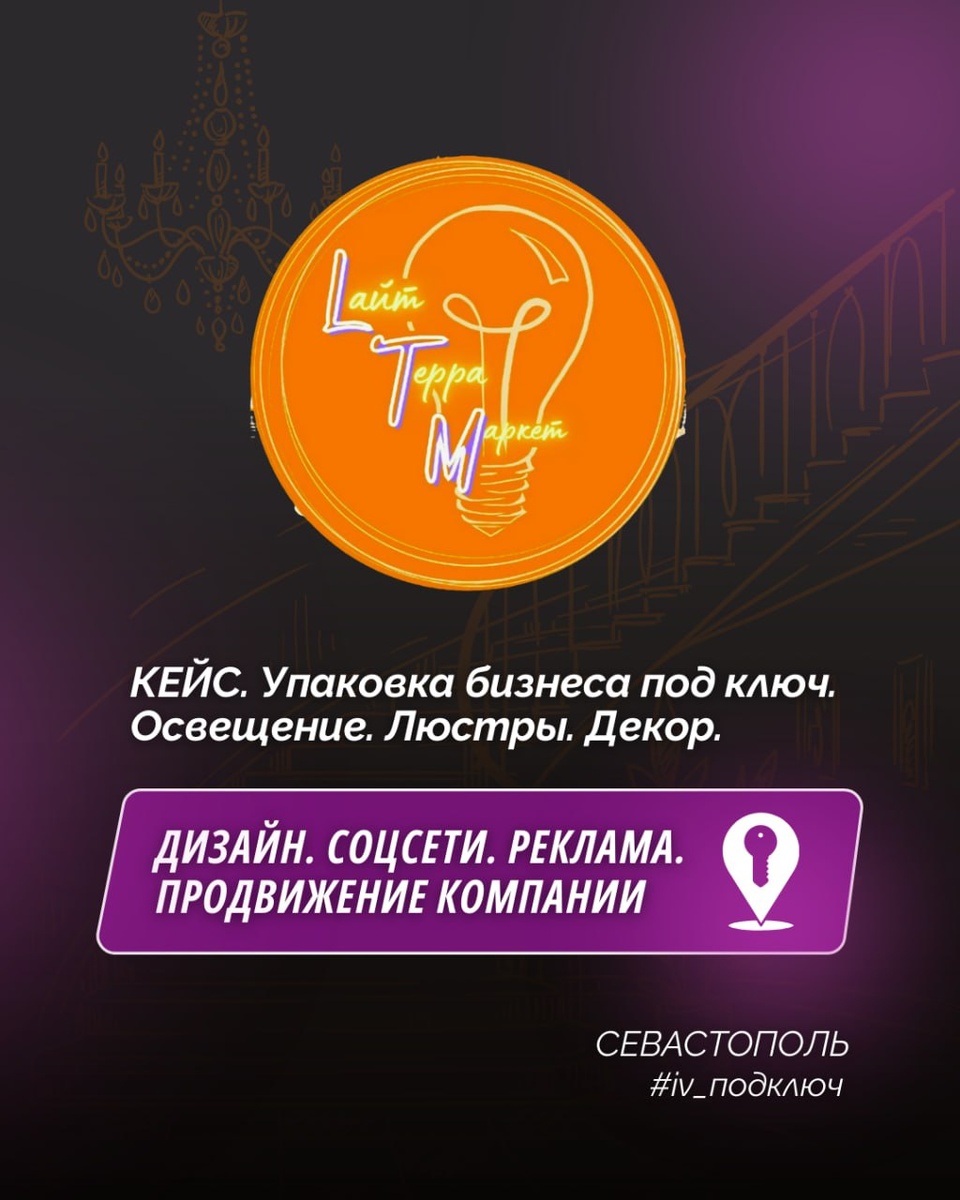 Севастополе. Погнали! 💜 Приступаем к работе. Клиент с города Севастополь. Владелец салона освещения "Лайт Терра Маркет". Салон работает офлайн, находится в современном ТЦ. 💜 Основная целевая аудитория - дизайнеры, строители, архитекторы. Так же салон имеет розничную базу клиентов. Примерное соотношение клиентов 50 на 50 ориентируясь на продажам. 💜 Основное отличие салона от обычного магазина электрики или освещения, наличие эксперта в этой области - владельца салона, который производит особую услугу - светотехнический расчет (позволяет подобрать освещение не просто по дизайну, но и так, чтобы не переплачивать и даже настроение было хорошее, если рассказать в 2х словах). Цели на проект? ❇️ Провести глубокий и тщательный анализ социальных сетей ❇️ Вывести ключевые моменты по улучшению медиа ресурсов ❇️ Сформировать стратегию развития салона с учетом ключевых преимуществ, конкуренции и пожеланий владельца салона ❇️ Упаковать и доработать социальные сети. ВК, Розовую сеть, Телеграм