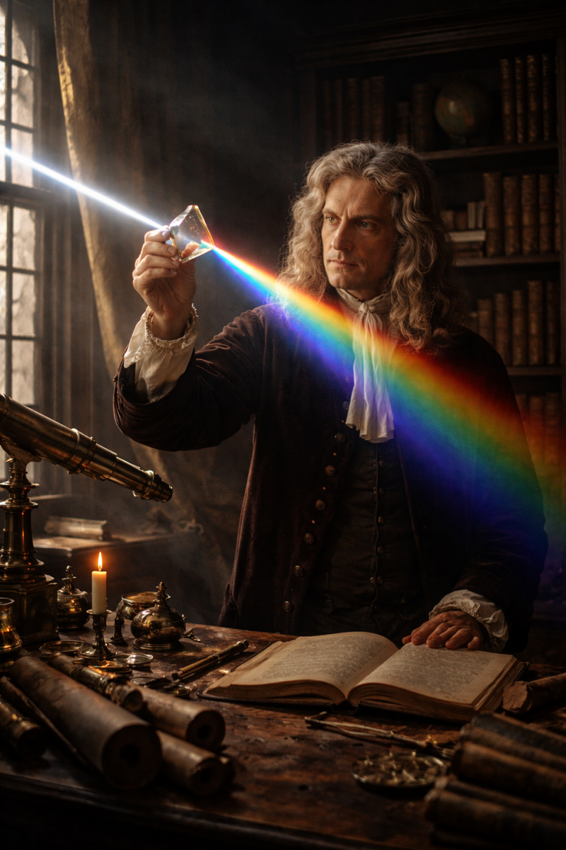 29-летний профессор из Кембриджа отправляет в Королевское общество письмо на девяти листах. В нём — эксперименты шестилетней давности с треугольной призмой. Коллеги ждут рассказа про телескоп. Получают взрыв. «Белого света не существует». 🔬 Призма как приговор Две тысячи лет все — от Аристотеля до Декарта — считали белый свет чистым и неделимым. Цвета? Искажение, загрязнение при прохождении через материю. Чем больше стекла — тем грязнее свет, тем ярче краски. Ньютон поставил две призмы подряд. Пропустил через первую солнечный луч — получил радугу. Взял из этой радуги один красный луч. Пропустил через вторую призму. Он остался красным. Не посинел. Не позеленел. Не «загрязнился». Цвет оказался не продуктом деградации света — а его врождённым свойством. Белый свет — это не чистота, а смесь. Все цвета сразу. Переворот на девяти страницах. ⚔ Атака с трёх сторон 8 февраля коллеги слушают работу «с необычайным вниманием и аплодисментами» — пишет секретарь общества. Неделю спустя начинается п