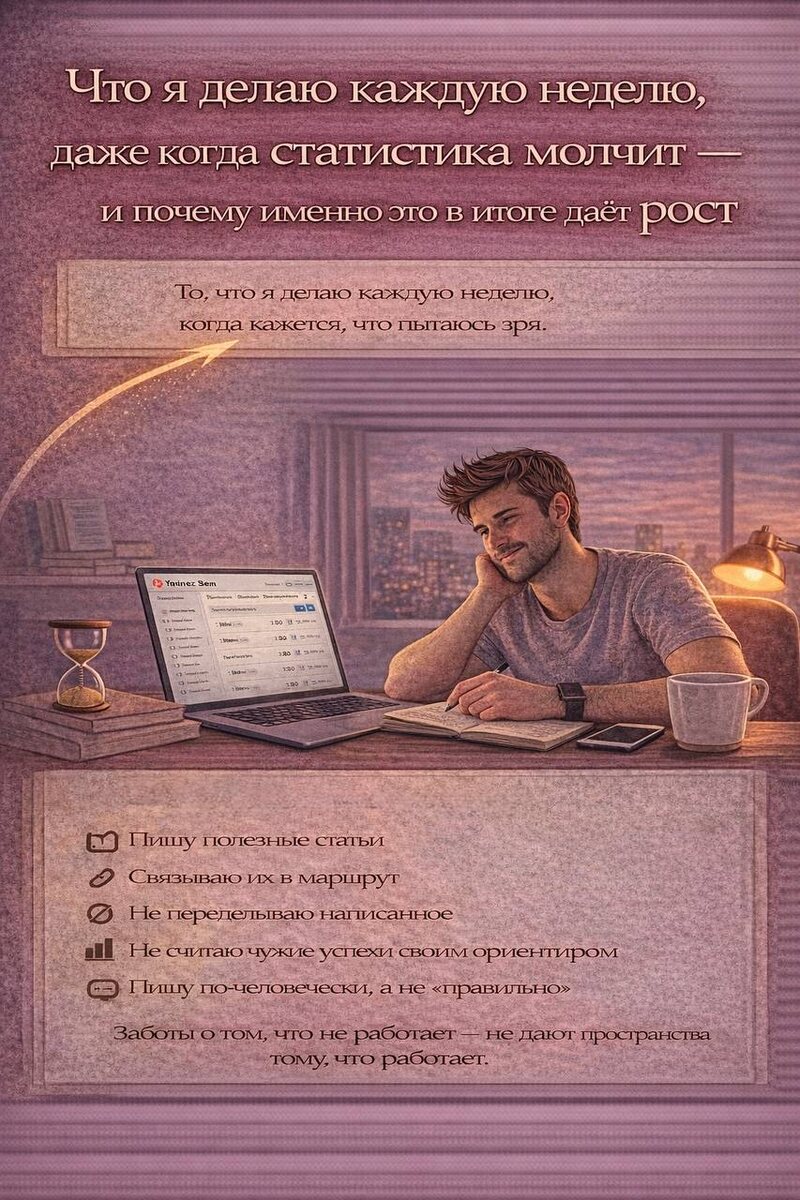 Эта статья — не про успехи. И не про красивые цифры. Она про то, что я делаю каждую неделю, даже когда в статистике тишина, а внутри иногда появляется мысль: «Может, всё это зря?» Я понял одну важную вещь: если ориентироваться только на цифры — долго не протянешь. Поэтому я стал ориентироваться на действия. Раньше я ждал от каждой недели: Сейчас — нет. Сейчас моя задача другая: прожить неделю правильно, а не «успешно». Это было самым сложным. Когда нет показов, руки тянутся: Я понял: паника — худший редактор. Теперь правило простое: если статья логичная, честная и в стиле канала — я её оставляю. Пусть она «лежит». В Дзене это нормально. Каждую неделю я смотрю на канал как на цепочку, а не как на набор текстов. Я спрашиваю себя: И только потом пишу. Именно так родились статьи: Это не случайные темы. Это путь. Это, пожалуй, главный перелом. Раньше я думал: «Если не зашло — значит, плохо написал» Сейчас думаю иначе: «Если не зашло — значит, ещё рано» Большинство статей в Дзене не стреляют