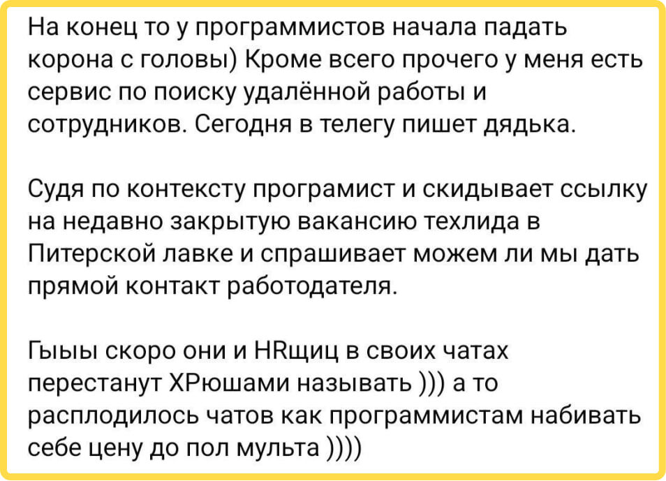 Не красиво, но сейчас, видимо, их предпочитают величать по имени и отчеству. Но вообще, HR нужен, тут я признаю. Наш опыт показывает, что пипец утомительно выбрать человека, если ты еще вынужден заниматься операционкой. Подбор - пожиратель времени. Я ведь работаю, а надо еще сидеть, ковыряться в резюме, согласовывать созвоны-встречи и т.п. Русский ИТ бизнес