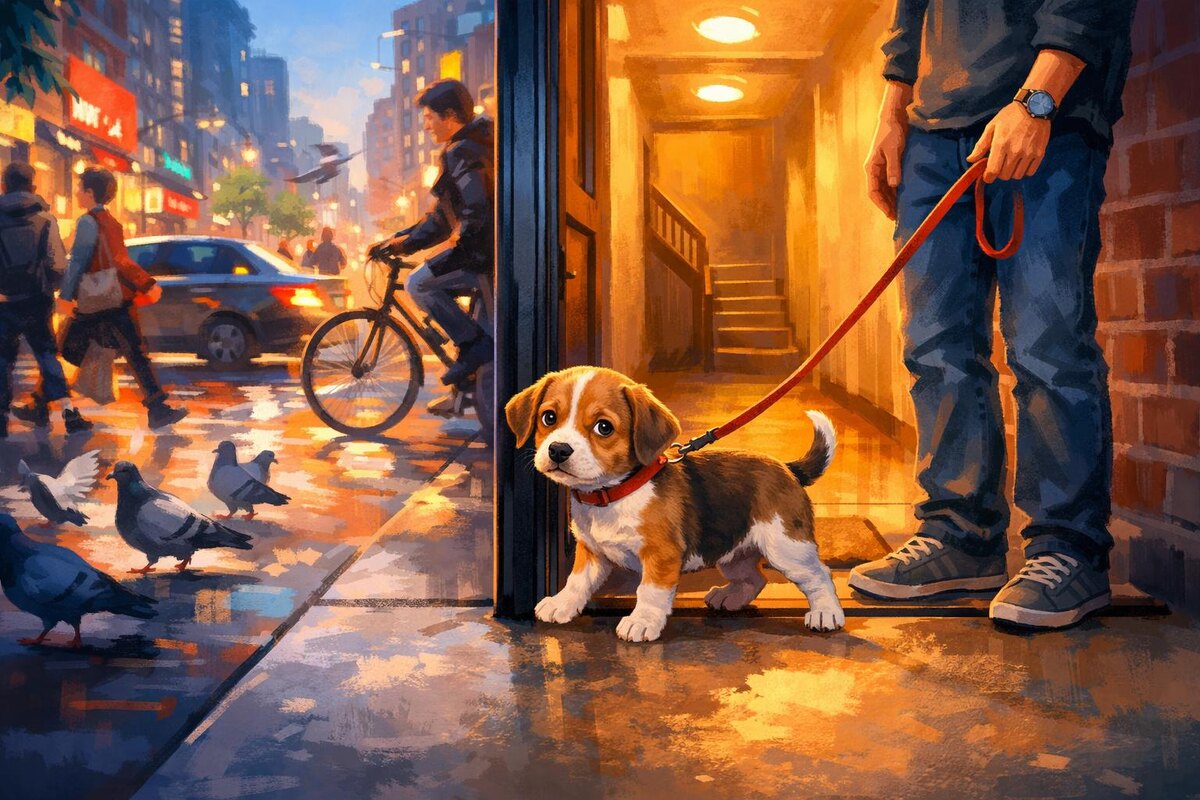 Вы собираетесь на первую «нормальную» прогулку. Поводок, пакетики, лакомство в кармане — всё как советовали. Открываете дверь подъезда, делаете шаг наружу… И щенок останавливается. Только что дома он носился, грыз игрушку, радостно вилял хвостом. А тут... Стоит как вкопанный. Уши прижались, хвост опустился, прижимается к вашей ноге. Вы присаживаетесь, зовёте мягко: «пойдём». Он делает один неуверенный шаг — и тут хлопает дверь, проезжает машина или кто‑то проходит мимо… И щенок резко тянет обратно. К подъезду. Домой. По дороге назад он уже снова оживает, виляет хвостом, будто ничего не было. А у вас внутри тяжёлое чувство: «Он боится. И, кажется, я не понимаю, как ему помочь». Это один из самых частых и самых тревожных моментов. Кажется, что прогулки должны приносить радость, а приносят только тревогу. Мы выходим из дома «на автомате». Для щенка же улица — это как словно бы вы внезапно оказались в огромном, шумном аэропорту в незнакомой стране. Дома всё знакомо: запахи, звуки, стены, в
