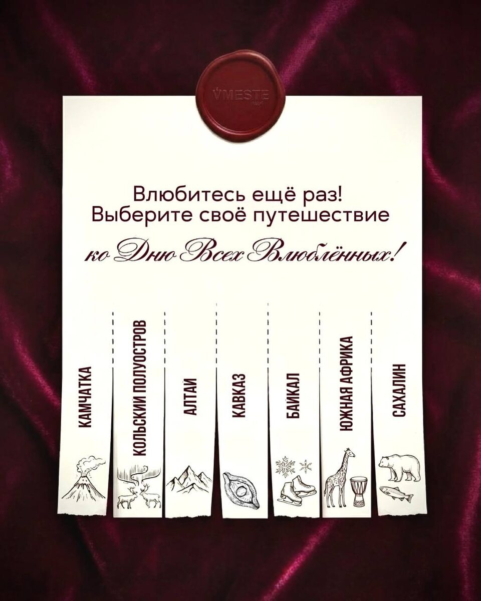 Любить — значит создавать моменты, которые остаются с вами дольше любых вещей. Украшения тускнеют, одежда устаревает, а впечатления от путешествия хранятся в сердце навсегда. Вернувшись домой, вы чувствуете себя ближе друг к другу, сильнее и счастливее — в этом и есть сила совместных приключений!✨ В Vmeste Travel мы создаём персональные путешествия для пар: ✅ с уединённым отдыхом в местах, где ничто не отвлекает друг от друга ✅ гастрономическими впечатлениями, превращающими каждый ужин в особенное событие ✅ активными приключениями в Дагестане, на Камчатке или в другой точке мира ✅ любыми датами и направлением — точно под ритм и характер вашей пары Если вы думаете, что подарить ко Дню всех влюблённых — возможно, ответ вы уже нашли в этом посте 😉 💘 Напишите нам, и мы предложим путешествие, которое точно захочется прожить вместе. Подписаться на канал