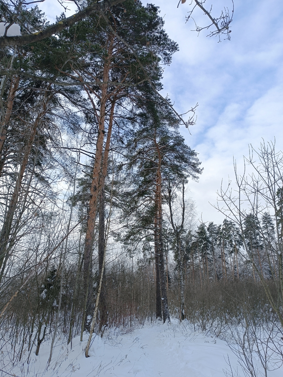 8 февраля 2026 года Здравствуйте, друзья! Вслед за пенсионерской субботой, пришло пенсионерское воскресенье. Все необходимые дела мы с Тузиком вчера переделали, затевать что-то генеральное в воскресенье не хотелось, диван привлекает мое внимание лишь очень дозированно, вот и собралась я опять после полудня погулять. Мороз не такой уж сильный, всего каких-то -12, но ветерок поднялся не очень ласковый, так что хочешь погулять, дорога одна - в лес. Ветра там нет, снег уже до меня притоптали, а идти до леса не больше 5-10 минут. Тропинки разбегаются в разных направлениях, но куда не пойди, везде красота. Сначала совсем близко от опушки сосны и голубое небо между ними. Чуть дальше начинаются ели, и становится сумрачнее. Снегу в этом году очень много, а может ещё больше будет. Народу не очень много гуляет, в основном с детьми или с собаками, или сразу и с теми, и с другими. Тропинка вилась вдоль забора вокруг дач, серьёзный такой забор, вход только по пропускам. А вот эта тропинка показалас