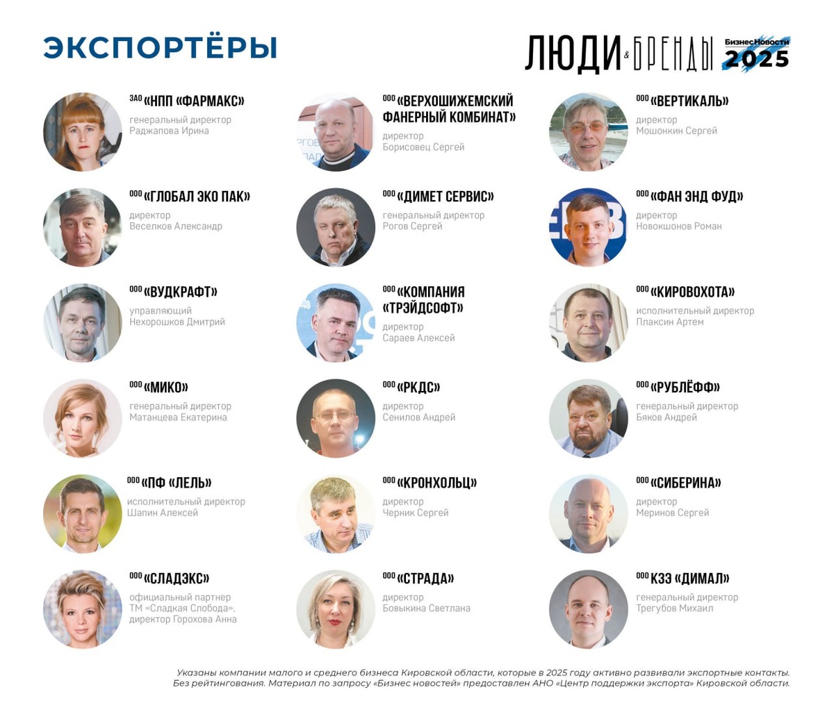 ). Сегодня озвучим часть результатов ежегодного рейтинга влияния от «Бизнес новостей» «Люди и Бренды-2025». Номинация «Экспортеры» появилась два года назад, и по итогам 2025 года мы ее сохранили. Публикуется вне рамок рейтинга и без мест. Указаны компании малого и среднего бизнеса Кировской области, которые в 2025 году активно развивали экспортные связи и контакты. Информация по запросу «Бизнес новостей» предоставлена АНО «Центр поддержки экспорта» Кировской области. В перечне вновь изменения. Из 18-ти вошедших в список по итогам 2025 года 8 компаний — новые: их не было в аналогичной номинации прошлого года. |Tг-канал «Бизнес новости» |Сайт bnkirov.ru | Группа ВК |