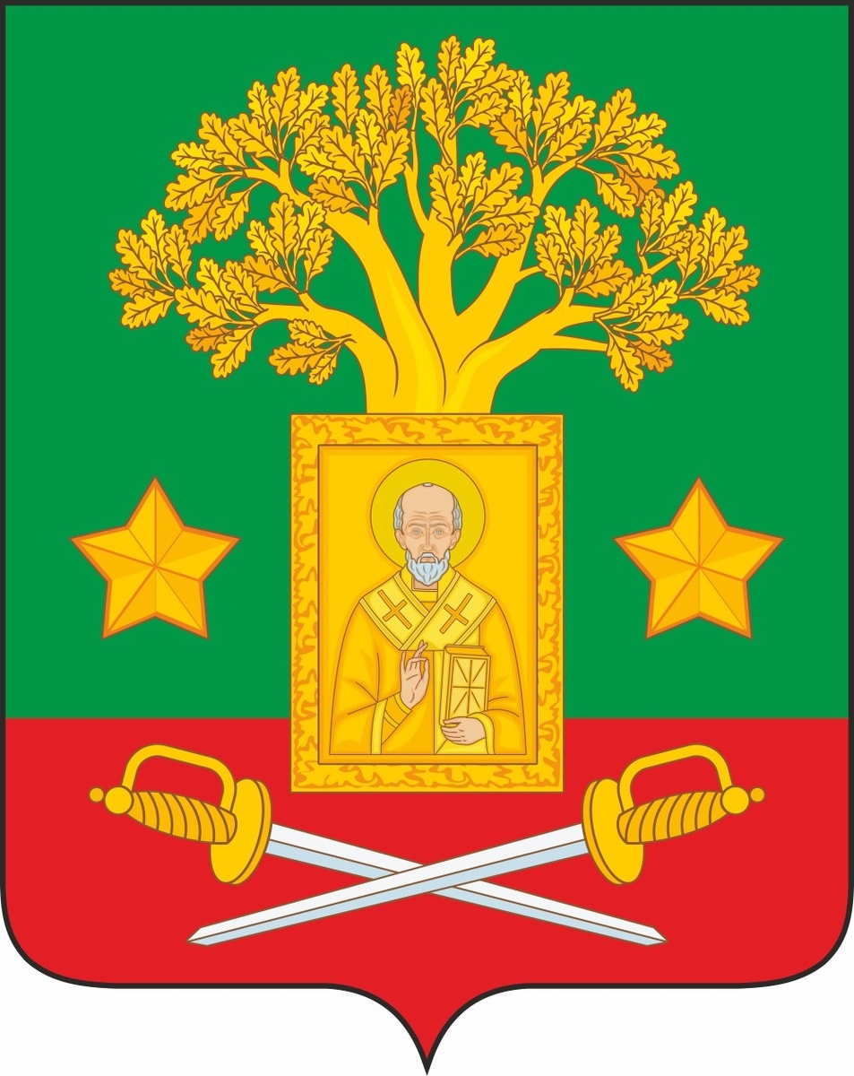"В зеленом поле, с червленой включенной оконечностью, поверх всего – золотая икона с образом Святого Николая Чудотворца, имеющего серебряные волосы и бороду и телесного цвета лицо и руки, из-за которой наполовину выходит золотой дуб; всё сопровождено по сторонам в зелени двумя золотыми пониженными пятиконечными звездами, а в оконечности – двумя серебряными, с золотыми эфесами шпагами, положенными накрест остриями вниз".