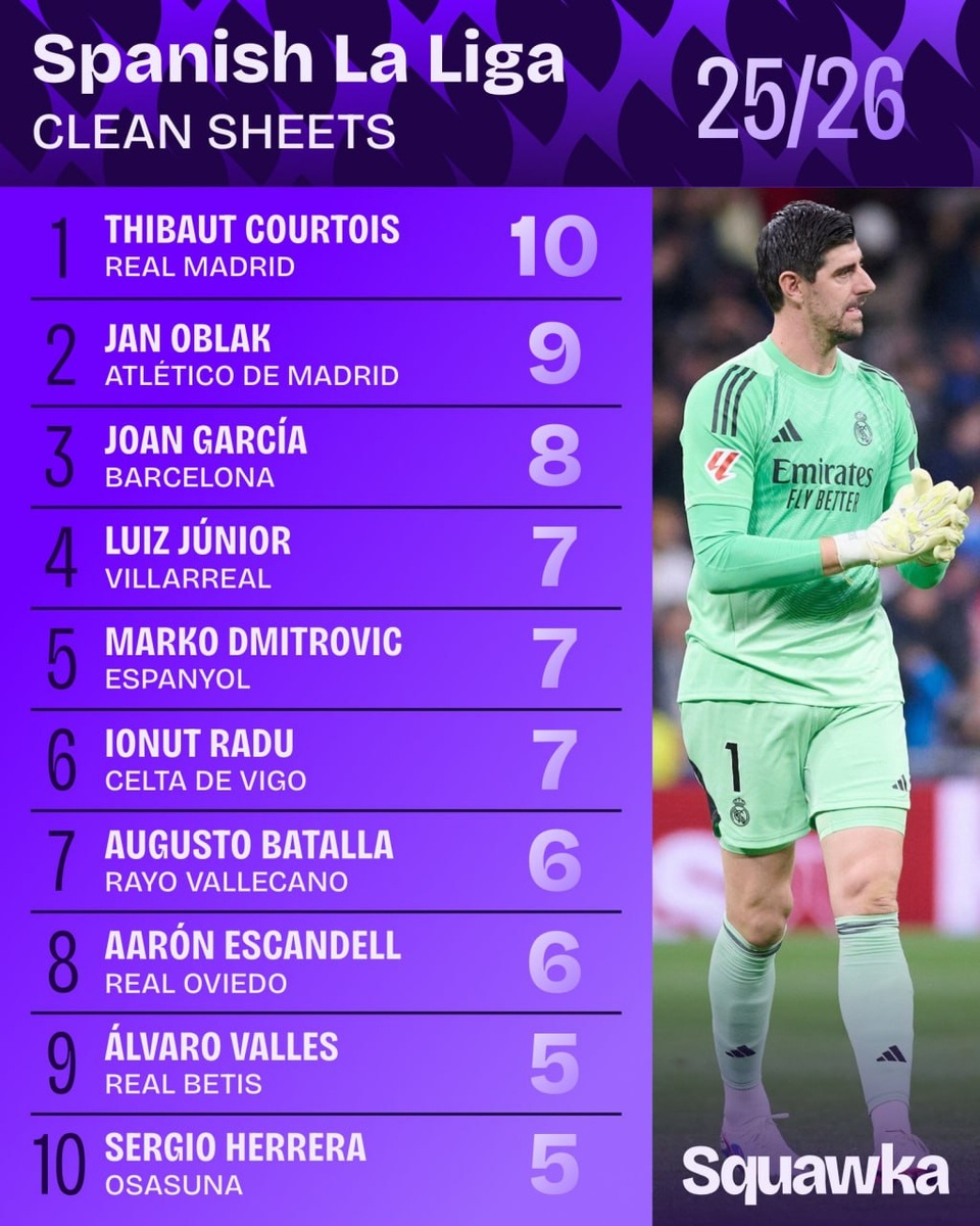 Лидеры по количеству "сухих" матчей в текущем розыгрыше LALIGA 🇪🇸