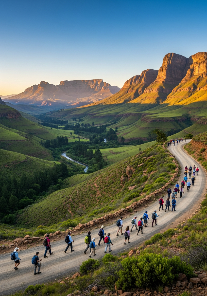 Дракенсберг предлагает десятки пеших маршрутов — от лёгких прогулок вдоль рек до многодневных треков по горным перевалам. Среди самых впечатляющих мест — амфитеатр Ройял-Наталь с водопадом Тугела, один из самых высоких водопадов в мире. Зимой на вершинах выпадает снег — редкое для Африки явление, привлекающее любопытных туристов.