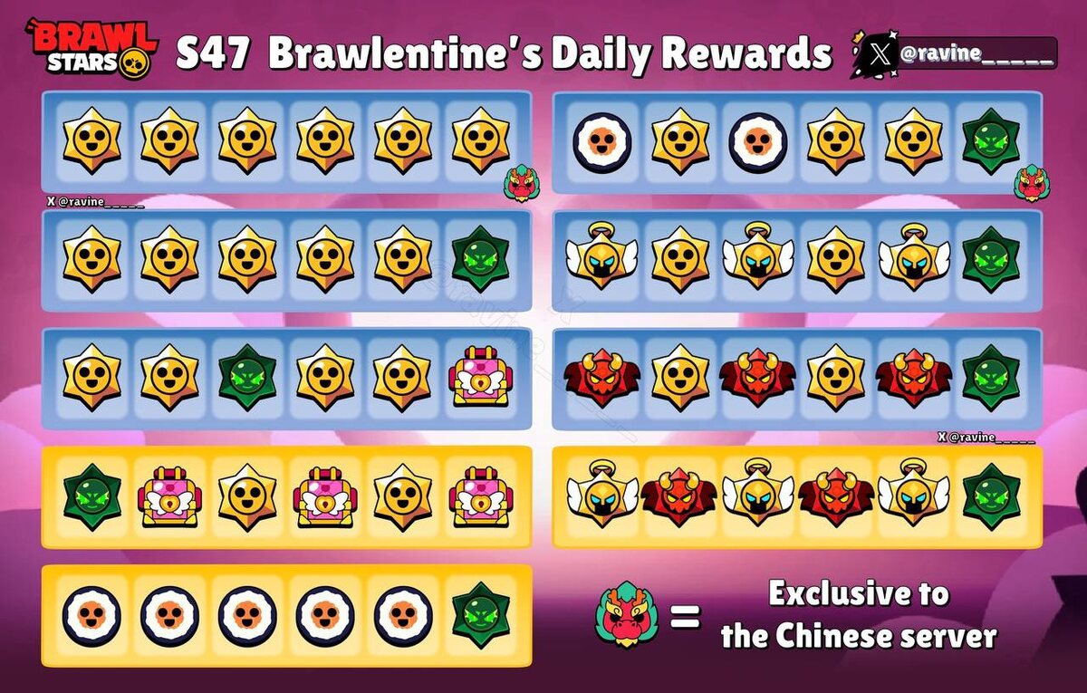 На картинке представлены все возможные варианты ежедневных наград в этом сезоне. Ящик любви попадается в двух вариантах, счастливых вариантов всего три. Первые две сборки доступны только в китайском Brawl Stars. ✅Новости по Clash Royale - ТЫК 💬Новости по Roblox - ТЫК Мир Supercell. Подписаться