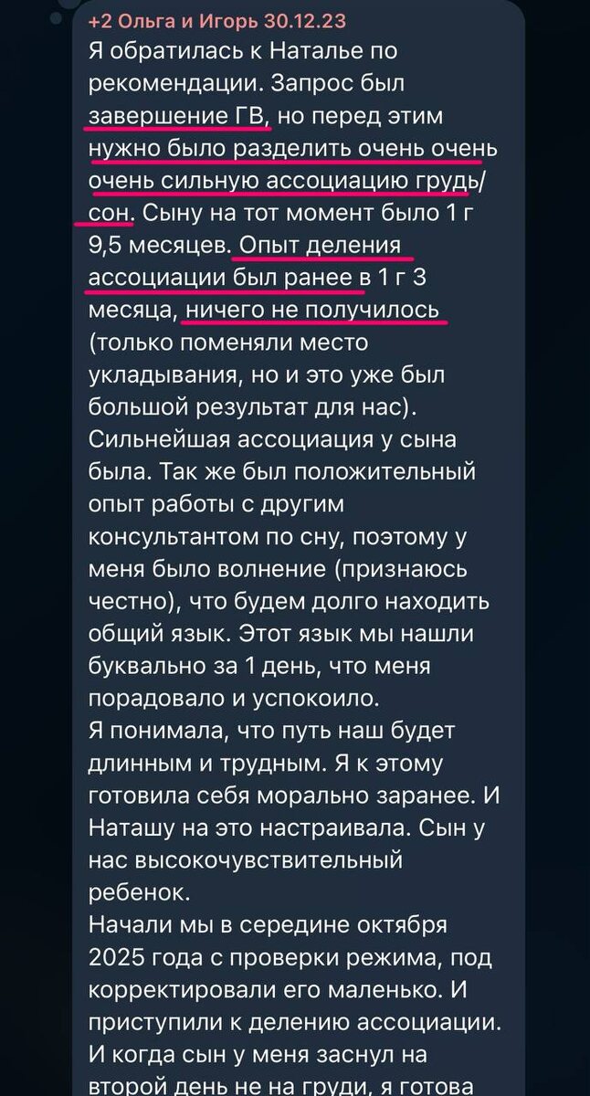 специалистов, в котором помогаем друг другу советами, перенаправляем мам за квалифицированной помощью, когда сами по какой-то причине эту помощь оказать не можем. Именно так Ольга попала ко мне. Опыт работы с прошлым консультантом был положительный, от этого Ольга относилась ко мне с осторожностью. Однако, ее сердце растаяло и так началась наша долгая работа по завершению их с Игорем ГВ. Ситуация была непростая, но и много работы было сделано до меня. Ольга с Игорем пришли ко мне с несколькими ночными пробуждениями, нечастыми регулярными ночными истериками, сильной ассоциацией сон-грудь и железным настроем завершить ГВ. Мы подкорректировали режим, много говорили о границах и адресном внимании, разделили ассоциацию и …. затормозили. Бывает тяжело расстаться с ролью кормящей матери, это нормально. Мы много говорили, взяли паузу, после которой продолжили работу. В итоге ушли от ночных пробуждений и истерик, мягко и душевно завершили ГВ. Вместе со всеми паузами и заморозками нам понад