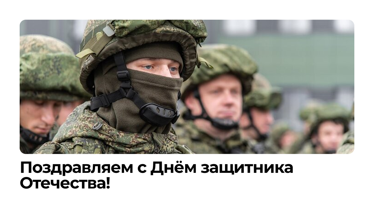 Уважаемые участники специальной военной операции! Примите искренние поздравления с Днём защитника Отечества! Этот праздник в особой степени относится к вам — тем, кто сегодня в реальных условиях выполняет задачи по защите страны, несёт службу в зоне повышенного риска, обеспечивает боевую работу, медицинскую помощь, связь, логистику и управление. Вы выполняете сложную, ответственную и опасную работу, требующую мужества, выдержки, профессионализма и верности долгу. На ваших плечах — безопасность государства, жизни товарищей и мирная жизнь тех, кто находится в тылу. Желаем вам крепкого здоровья и стойкости, надёжного тыла и поддержки семьи, грамотного и ответственного командования, своевременного обеспечения всем необходимым! Пусть каждая выполненная задача завершается благополучным возвращением. Пусть рядом всегда будут проверенные товарищи, а дома ждут родные и гордятся вами. Победа близко!