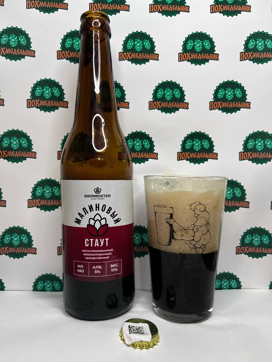 Статистика: пивной напиток непастеризованный нефильтрованный неосветленный, объёмная доля спирта 5% об., экстрактивность начального сусла - 17%, состав: вода подготовленная (исправленная), солод пивоваренный ячменный светлый, солод пивоваренный ячменный карамельный, солод пивоваренный ячменный жженый, солод пивоваренный ячменный шоколадный, концентрированный сок малины, хмель, дрожжи пивные, сорбат калия. Объём: 450 мл Дата розлива: 22.01.2026 Изготовитель: ООО «ПК Хлебнаш», Россия, Волгоградская область, г. Волжский По-братски: и вторая новинка от ресторана-пивоварни Biermeister. Это я так понимаю реинкарнация старого сорта. Я помню у них был уже малиновый стаут и я его пил и даже делал обзор. На нашей странице в «Дзен» есть обзор. Так вот, выяснилось, что прошлая версия была 5.2% об., а эта чуть ниже 5% об. Ну и ладно, не будем ворошить прошлое, а просто отведаем современного, в данном случае пива. В ароматике ярко звучит малина, очень мощная пена, сильная газация, во вкусе нотка гор