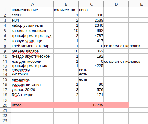 Цену самодельной акустики я написал в предыдущих частях. В этой части напишу, во сколько обошелся усилитель SE на лампах EL34, ECC83. На сегодняшний день усилитель работает, никаких настроек я не делал. После 5 часов беспрерывной работы силовой трансформатор горячий в районе пластин. Руку держать можно, но все равно так явно не должно быть. В ближайшие дни попробую найти причину. По звуку