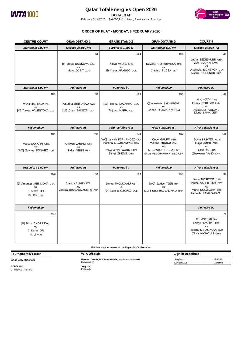 В одиночном разряде сегодня сыграют: Alexandra EALA - Tereza VALENTOVA Linda NOSKOVA - Maya JOINT Katerina SINIAKOVA - Clara TAUSON Xinyu WANG - Emiliana ARANGO Emma NAVARRO - Tatjana MARIA Dayana YASTREMSKA - Cristina BUCSA Anastasia ZAKHAROVA - Jelena OSTAPENKO Maria SAKKARI - Zeynep SONMEZ Qinwen ZHENG - Sofia KENIN Anna KALINSKAYA - Jessica BOUZAS MANEIRO Emma RADUCANU - Camila OSORIO Janice TIEN - Beatriz HADDAD MAIA В парном разряде: Laura SIEGEMUND/Vera ZVONAREVA - Lyudmyla KICHENOK/Nadiia KICHENOK Miyu KATO/Fanny STOLLAR - Alexandra PANOVA/Diana SHNAIDER Amanda ANISIMOVA/Ка. Pliskova - S. Kartal/М. Linette Mirra ANDREEVA - Leylah FERNANDEZ/Kristina MLADENOVIC Coco GAUFF/Victoria MBOKO - Cristina BUCSA/Nicole MELICHAR-MARTINEZ Storm HUNTER/Maya JOINT - Yifan XU/Zhaoxuan YANG Linda NOSKOVA/Tereza VALENTOVA - Marie BOUZKOVA/Liudmila SAMSONOVA Eri HOZUMI/Fang-Hsien WU - Tereza MIHALIKOVA/Olivia NICHOLLS Подпишись на Эйс и точка