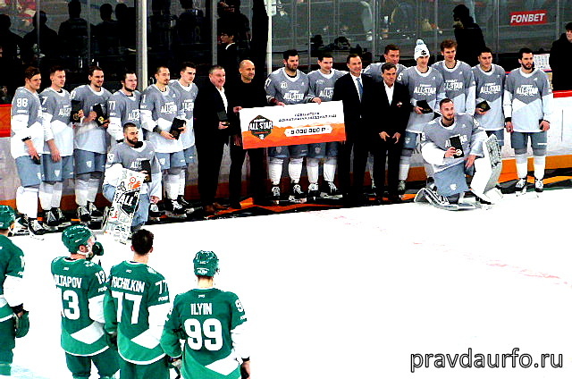 Молодежная команда, таким образом, стала обладателем серебряных наград и чека на 4 млн рублей, а золото и 8 млн достались российским звездам. Церемонию награждения провели полномочный представитель президента России в УрФО Артем Жога и президент КХЛ Алексей Морозов. Добавим, лучшим игроком финала признали автора пяти шайб Аймурзина.