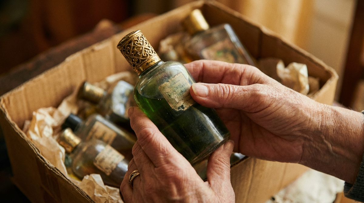 Флаконы стояли в шкафу. Зелёное стекло, золотые крышечки. Память, запечатанная в пустоте.