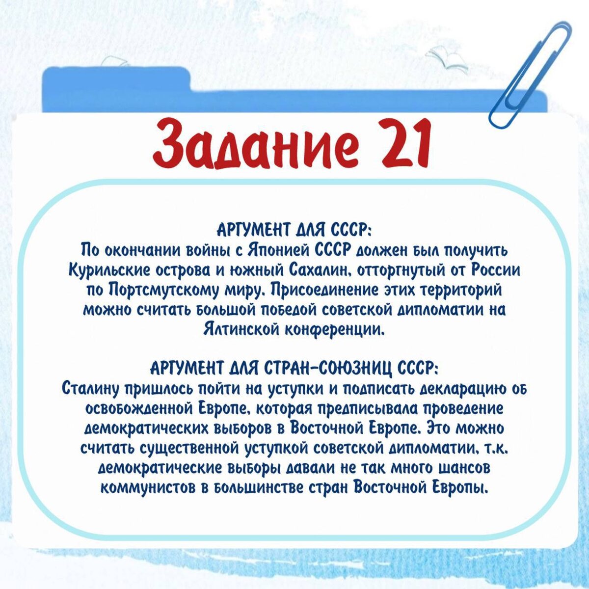 ! Вот пример 🩵💙 задания по истории и ответ на максимальный балл↘️ В 1945 г. состоялась Ялтинская конференция. Она занимает центральное место в истории встреч лидеров «Большой тройки», т.к. решения Ялты повлияли и на ход Второй мировой войны, и на устройство послевоенного мира. Используя исторические знания, приведите аргументы в подтверждение точки зрения, что и для СССР, и для его союзников (Великобритания, США) решения Ялтинской конференции по послевоенному устройству мира были выгодными. При изложении аргументов обязательно используйте исторические факты. Аргумент для России СССР:_______________ Аргумент для стран-союзниц СССР:_____________ Не жалейте 🔥