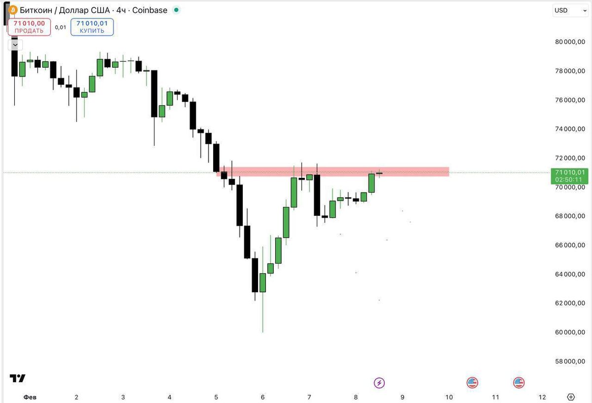 Откуп наступает 📈 BTC $71к, ETH $2.1k. Упираемся в сопротивление. Пробиваем — летим на $75-76к. Отбиваемся — падаем ниже $70к. Всё просто. Следим за пробоем.