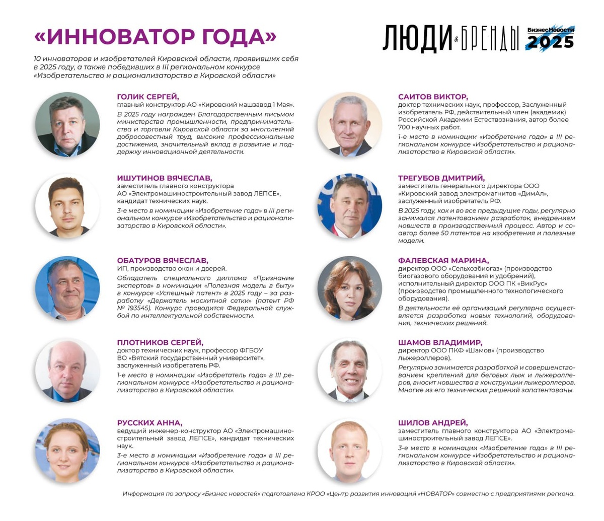 ). Это новая номинация рейтинга. Она формируется вне рамок голосования и без ранжирования мест. В ней мы решили показать инноваторов и изобретателей Кировской области, проявивших себя в 2025 году, а также победивших в III региональном конкурсе «Изобретательство и рационализаторство в Кировской области». Информация по запросу «Бизнес новостей» подготовлена КРОО «Центр развития инноваций «НОВАТОР» совместно с предприятиями региона. Кстати, поздравляем всех причастных ко Дню российской науки, который отмечается сегодня, 8 февраля! А результаты рейтинга мы продолжим публиковать завтра с утра.