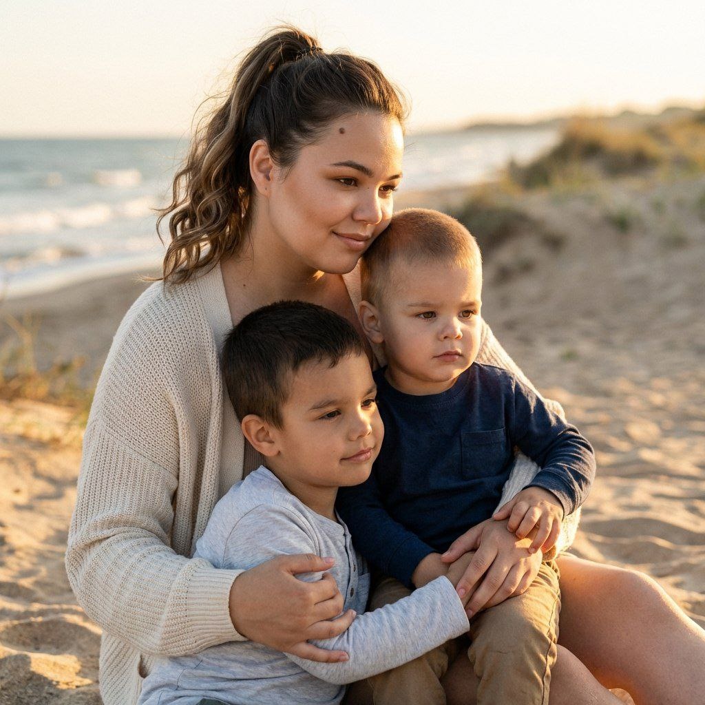 😀Выбираем "нейросети" 😀Нажимаем "Nano Banana" 😀Нажимаем "Nano Banana Pro" 😀Прикрепляем через скрепку свое фото и выбранный промпт 😀Наслаждаемся результатом😍 Создай фото не меняя черты лица и цвет волос. Фотореалистичный тёплый семейный портрет на пляже: женщина в кремовом вязаном кардигане/свитере, высокий хвост с мягкими волнами, минимальный натуральный макияж (ровная сатиновая кожа,контуринг , лёгкий румянец, нейтральные губы), без ярких украшений; двое мальчишек , одному 5 лет ( фото 2), другому 3 года (фото 3), в простых хлопковых лонгсливах — один светло‑серый, другой тёмно‑синий, сидят у неё на коленях в нежном объятии. Поза интимная и расслабленная, средний план по пояс, взгляд в сторону/вниз, лёгкая улыбка, руки аккуратно охватывают детей. Освещение — мягкий боковой/заполняющий свет золотого часа, тёплые блики на волосах, объёмное боке, натуральные цвета и текстуры кожи/ткани. Технически: 50–85mm, f/1.8–2.8, ISO100–200, shallow DOF, photoreal, warm cinematic grade, subtl