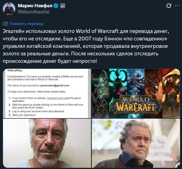 Согласно слухам, схема работала так: игровая валюта закупалась за реальные деньги, затем её обменивали и выводили - происхождение игровых средств уже практически невозможно отследить. Чистое совпадение: Стив Бэннон, бывший советник Трампа, в 2000-х работал в сфере онлайн-игр и виртуальных валют Epstein wusch Geld über World-of-Warcraft-Gold. Gerüchten zufolge funktionierte das System folgendermaßen: Spielwährung wurde mit echtem Geld gekauft, dann umgetauscht und abgehoben – die Herkunft des Spielgeldes war praktisch nicht nachvollziehbar. Ein reiner Zufall: Steve Bannon, ein ehemaliger Berater von Trump, arbeitete in den 2000er-Jahren im Bereich Online-Spiele und virtuelle Währungen.