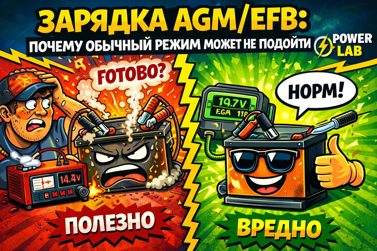 - AGM/EFB отличаются от обычной кислотной конструкцией и поведением при заряде, поэтому обычный режим может не подойти.