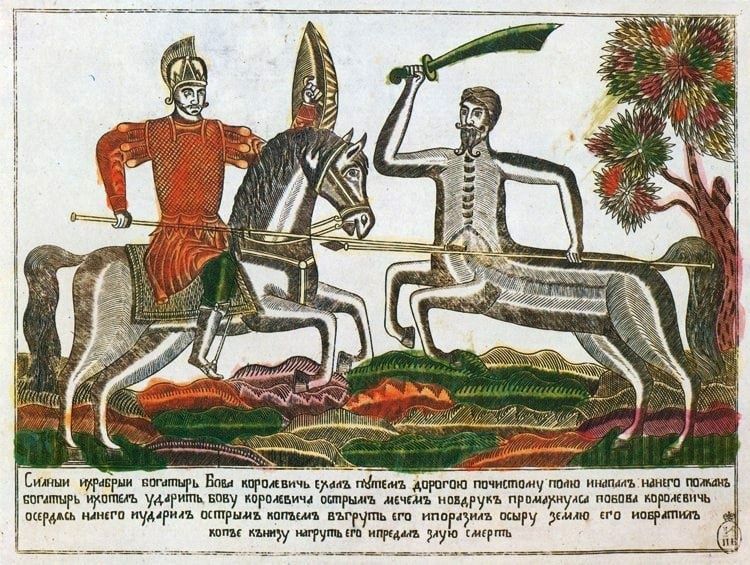 ! Бова королевич и Полкан. Лубки XVIII-XIX вв. "Силный и храбрый богатырь Бова королевичь ехал путем дорогою по чистому полю, и напал на него Полкан богатырь, и хотел ударить Бову королевича острым мечем, но вдрук промахнулса, но Бова королевичь осердясь на него и ударил острым копъем в груть его, и поразил о сыру землю его, и обратил копъе кънизу на груть его, и предал злую смерть"