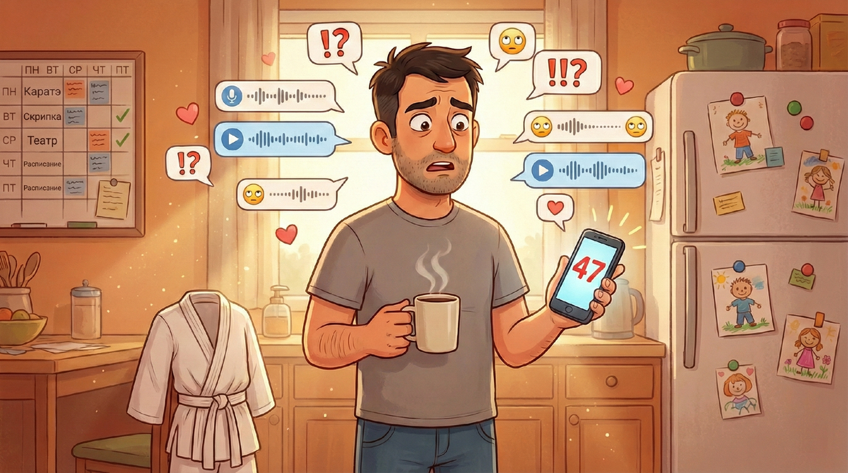 Среда, без пятнадцати восемь утра. Я стою на кухне, держу кружку с кофе и смотрю в телефон. В семейном чате сорок семь непрочитанных. Сорок семь. Со вчерашнего вечера.
