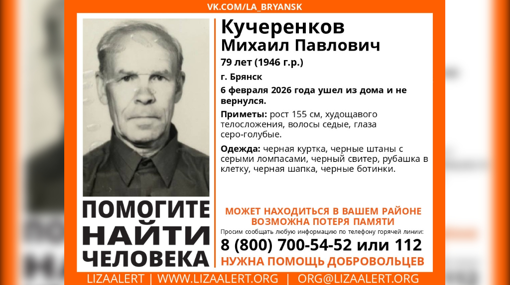 Михаил Кучеренков пропал 6 февраля. С тех пор информации о его местонахождении не поступало. К розыску подключились добровольцы «Лиза Алерт». Всех, кто может сообщить сведения о пропавшем, просят обратиться в экстренные службы или к поисковикам. В Брянске организованы поиски 79-летнего Михаила Кучеренкова, местонахождение которого остается неизвестным с 6 февраля. О начале розыска сообщили представители поисково-спасательного отряда «Лиза Алерт». По данным добровольцев, рост мужчины около 155 сантиметров, телосложение худощавое, волосы седые, глаза серо-голубые. Отмечается, что у пропавшего возможны проблемы с памятью. В день исчезновения он был одет в черную куртку и темные брюки, свитер, клетчатую рубашку, черную шапку и ботинки. Всех, кто располагает информацией о возможном местонахождении мужчины, просят сообщить по телефону горячей линии отряда 8-800-700-54-52. Также можно звонить по номеру экстренных служб 112. Напомним, в начале недели в Брянске искали исчезнувшего Феликса Казак