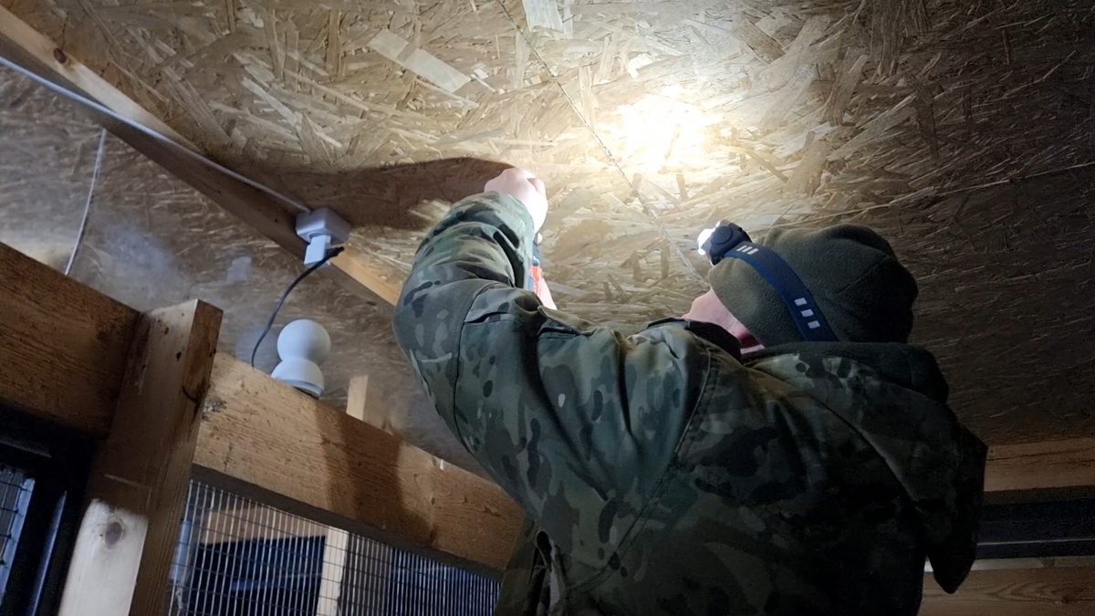 Артём прикрутил камеру наблюдения в вольере у цветочных ошейниковых сов. За сороками теперь не получится наблюдать, зато вход в совиный домик хорошо видно.