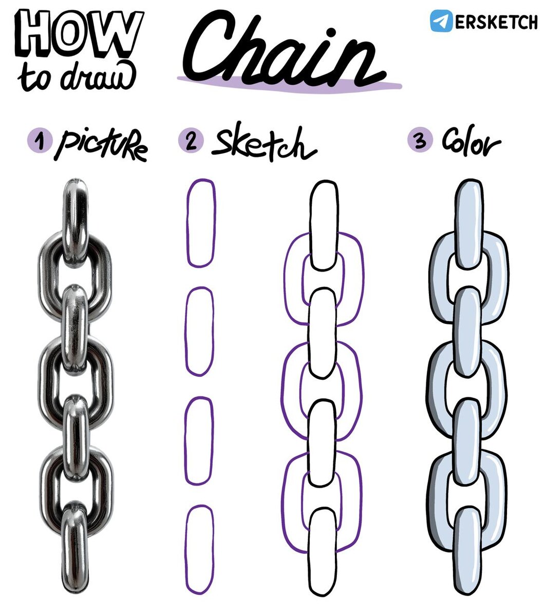 Чтобы нарисовать узнаваемую цепь, достаточно двух-трёх звеньев, но при желании можно нарисовать и больше. Сначала нарисуйте прямоугольники с закруглёнными краями на небольшом расстоянии друг от друга, а потом соедините их по бокам полуовалами той же толщины. Ещё можно добавить тени и блики.