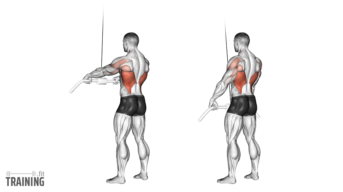 - Можно использовать канатную рукоять вместо прямой — это позволит увеличить амплитуду и лучше включить нижние волокна широчайших мышц.