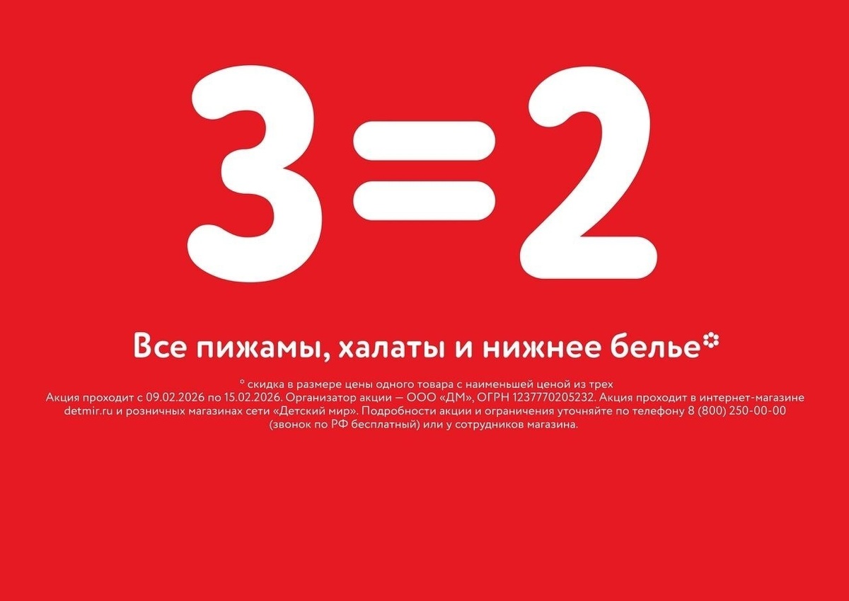 Все пижамы, халаты, нижнее белье 3=2 Период: c 09.02.2026 по 15.02.2026 При покупке трёх товаров из ассортимента, участвующего в акции, покупателю предоставляется один из них с наименьшей ценой в подарок https://ya.cc/8jeGJk #Промокоды #Купоны #Акции #Скидки