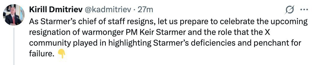 «Пока глава аппарата Стармера уходит в отставку, давайте готовиться праздновать предстоящую отставку разжигателя войны, премьер-министра Кира Стармера, а также роль, которую сообщество X сыграло в освещении его недостатков и склонности к провалам». Сальное Дифлопэ