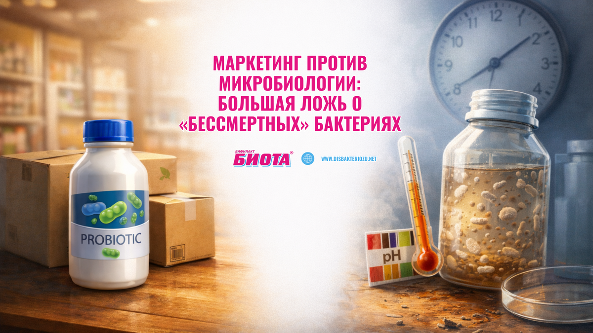 В мире маркетинга слово «живой» стало удобным ярлыком, который лепят на всё — от йогуртов до косметики. Но у биологии нет отдела маркетинга, у неё есть законы. И главный закон гласит: активная жизнь требует условий. Если вы видите на полке или в интернет-магазине жидкий пробиотик со сроком годности 90 дней, который обещают прислать вам обычной почтой в коробке, — остановитесь. Вы столкнулись с парадоксом, который противоречит микробиологии. Почему «бессмертных» бактерий не существует? Живые бифидо- и лактобактерии в жидкой среде — это не гербарий. Это активные микроорганизмы. Они постоянно едят, дышат и выделяют органические кислоты. Вот что происходит в бутылке на самом деле: 1. Закисление: Если бактерии активны, они постоянно снижают pH среды. При комнатной температуре этот процесс идет так быстро, что уже через несколько дней концентрация кислоты становится смертельной для самих же бактерий. Они буквально «выжигают» свою среду обитания. 2. Голод: Бактерии потребляют питательные веще