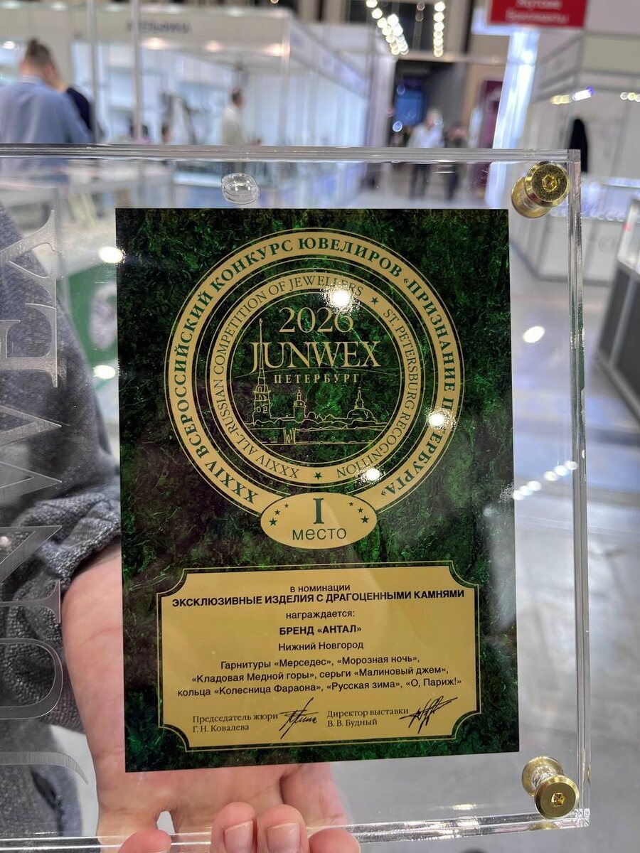 ! С огромной гордостью и радостью сообщаем, что бренд «АНТАЛ» (Нижний Новгород) стал победителем 🥇 34-го Всероссийского конкурса ювелиров «Признание Петербурга» на выставке Junwex 2026! ✅ В номинации: Эксклюзивные изделия с драгоценными камнями. ✅ Наш результат: Золото и первое место среди 104 работ от 47 предприятий со всей России! Наши работы-победители: · Гарнитуры: «Мерседес», «Морозная ночь», «Кладовая Медной горы». · Кольца: «Колесница Фараона», «Русская зима», «О, Париж!». · Серьги: «Малиновый джем». Авторы: Сладков С., Сладкова Е. Мастера-ювелиры: Филатов А., Рябов С., Сухарева Н. Это высшее признание мастерства, таланта и кропотливого труда всей нашей команды! Мы бесконечно благодарны экспертам и вдохновлены вашей поддержкой. ✨ Подробнее о конкурсе и всех победителях — в официальной новости #АнталПобедитель #ПризнаниеПетербурга #Junwex2026 #ЮвелирныйКонкурс #ЗолотоПетербурга #ЮвелирноеИскусство #НижнийНовгород #ЭксклюзивныеИзделия #ЮвелирыРоссии