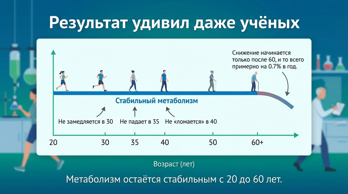 Результат удивил даже учёных. Метаболизм остаётся стабильным с 20 до 60 лет. Не замедляется в 30. Не падает в 35. Не «ломается» в 40. Cнижeниe начинается только после 60, и то всего примepнo на 0.7% в год.