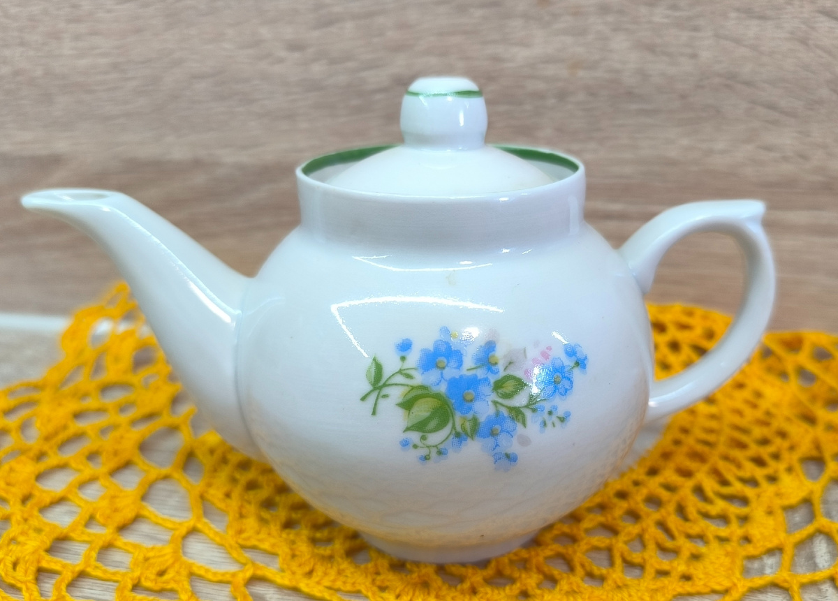 Добрый день или вечер, дорогие друзья! Хочу сегодня поделиться с Вами своим новыми приобретениями с Авито. Долго не думала о покупке, увидела решила брать 😋. Мне очень понравился миниатюрный чайник с цветочной деколью. Милые голубые незабудки, с зеленой отводкой по контуру у горлышка чайника. Дулевский малыш. И вот делая его фото поняла, что - то знакомое в его формах есть и точно. Есть у меня его собрат чайник с хризантемами, тоже Дулёво, один в один только больше в два раза. В общем оба хороши эти красавчики. Второй покупкой стал конечно тоже чайник, уже "прицепом" шел. Мне понравились его цветочки на боку - красный и синий. Чайник с красной отводкой по контуру у горлышка, носика и на ручке. Когда его привезли домой, я увидела что на другом бочку рисунок отличается. Там одиночный не распустившийся бутон красного цветка, он даже больше понравился (фото этой стороны на авито не было). Чайник оказался производство северная Корея времен СССР, в клейме - "MADE IN O.P.R.K.", думаю